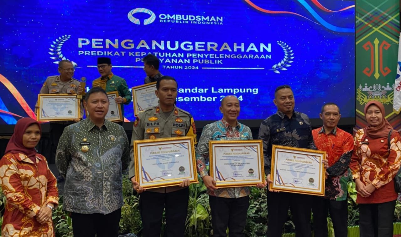 Penghargaan ini juga dihadiri oleh berbagai pejabat penting, termasuk Penjabat Bupati Tanggamus, Kepala Perwakilan Ombudsman RI Provinsi Lampung, dan Pj. Gubernur Lampung, Samsudin.