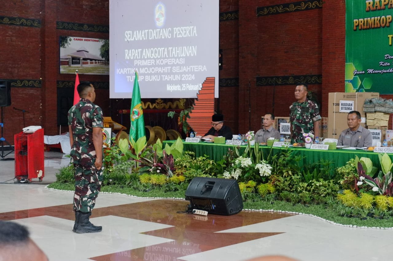 Mojokerto, – Kodim 0815/Mojokerto menggelar Rapat Anggota Tahunan (RAT) Primkop Kartika Mojopahit Sejahtera Tutup Buku Tahun 2024 di Wisata Desa Bumi Mulyo Jati (BMJ) Mojopahit, Desa Randugenengan, Kecamatan Dlanggu, Kabupaten Mojokerto, Jawa Timur, Selasa (25/02/2025).