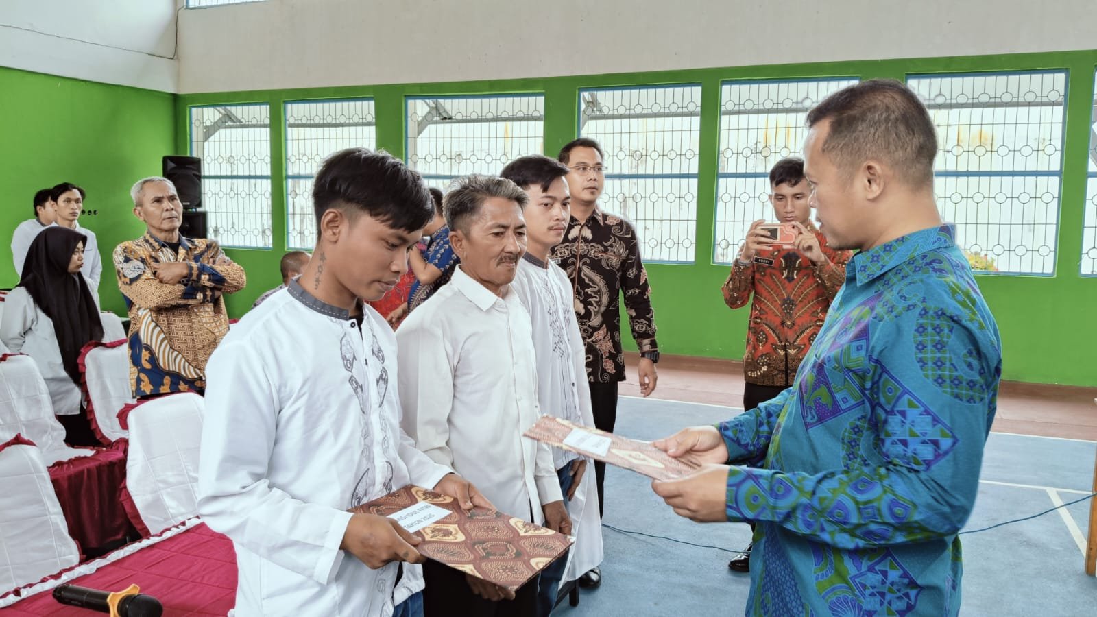 Kalapas Kotaagung Andi Gunawan didampingi Kasi. Binadik & Giatja, Kasi. Adm. Kamtib, Kasubbag Tata Usaha, Kasubsi Regbimkemas mengikuti zoom bersama dengan petugas dan warga binaan secara khidmat serta turut melaksanakan SK Remisi Khusus Hari Raya Idulfitri 1446 H secara simbolis kepada 383 warga binaan Lapas Kelas IIB Kotaagung di Aula Besar Lapas Kotaagung.