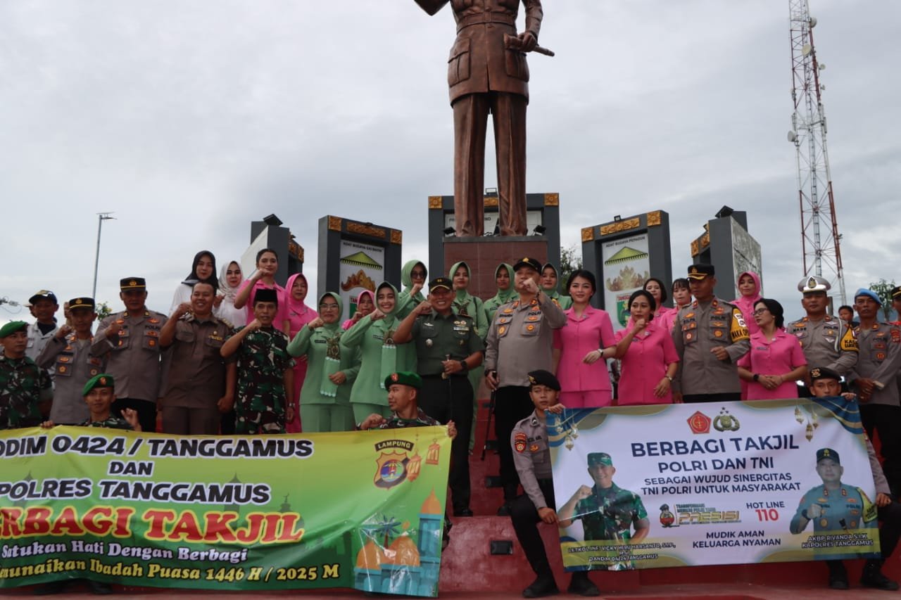 Sebagai bagian dari kegiatan “Bhayangkari Peduli,” Polres Tanggamus dan Kodim 0424/TGM menutup kegiatan dengan membagikan takjil gratis kepada masyarakat di Kota Agung.