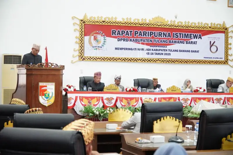 Majalahglobal.com.COM—-Tulang Bawang Barat, memperingati HUT ke-16 Kabupaten Tulangbawang Barat (Tubaba) Tahun 2025, Pemkab Tubaba menyelenggarakan Rapat Paripurna Istimewa di Gedung DPRD setempat pada Rabu (09/04).