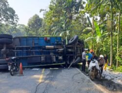 Tanggamus, majalahglobal.com – Sebuah truk tronton bermuatan hebel (bata ringan) terguling di Jalan Lintas Barat (Jalinbar) tanjakan Sedayu, Kabupaten Tanggamus, Kamis pagi (1/5/2025).