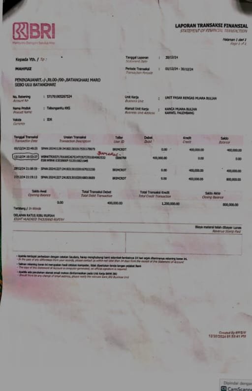 Mahpuz menyebutkan dari rekening koran terlihat bahwa telah terjadi penarikan pada tanggal 01/12/24 sejumlah Rp. 400,000 dengan sisa saldo kosong