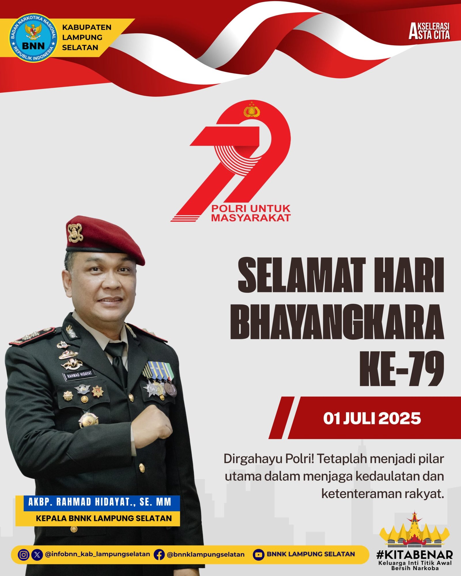 Kepala BNNK Lampung Selatan, Ucapkan Selamat HUT Bhayangkara Ke – 79: Polri Untuk Masyarakat.