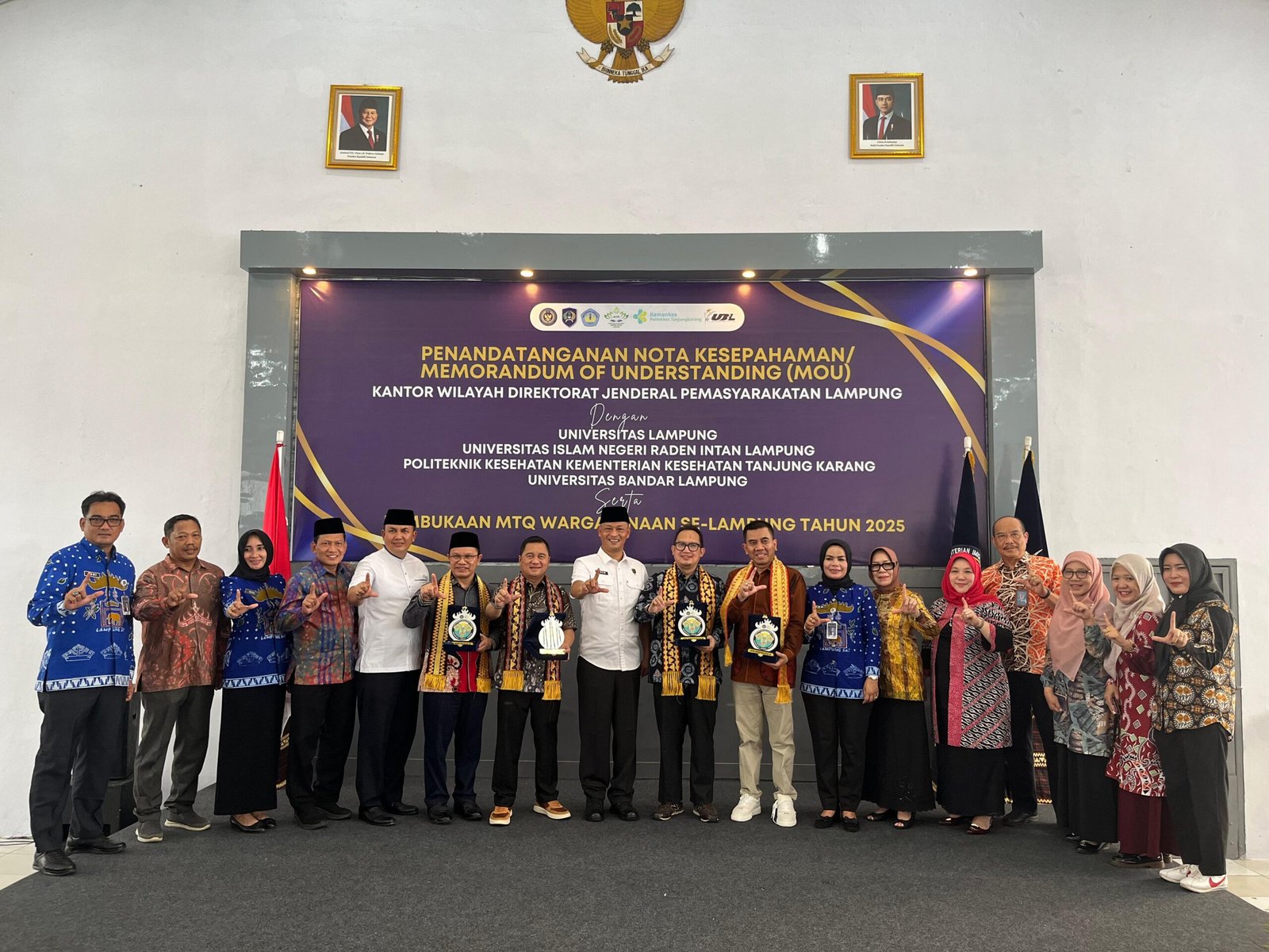 Bandar Lampung, majalahglobal.com — Kantor Wilayah Direktorat Jenderal Pemasyarakatan (Kanwil Ditjenpas) Lampung bersama Universitas Lampung, UIN Raden Intan Lampung, Poltekkes Tanjung Karang, dan Universitas Bandar Lampung (UBL) resmi menandatangani Nota Kesepahaman (MoU) terkait implementasi Tridharma Perguruan Tinggi dalam mendukung sistem dan fungsi pemasyarakatan, Jumat (15/8/2025).