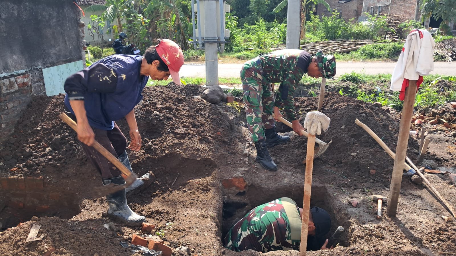 Pantauan di lapangan, anggota Satgas TMMD Kodim 0815/Mojokerto bersama warga setempat tampak bergotong-royong menggali tanah dan menyiapkan pondasi untuk tandon air yang akan menjadi bagian utama dari instalasi sumur bor. Proses ini dilakukan secara manual dengan peralatan sederhana, namun semangat kebersamaan dan gotong royong menjadi kunci utama percepatan pembangunan.