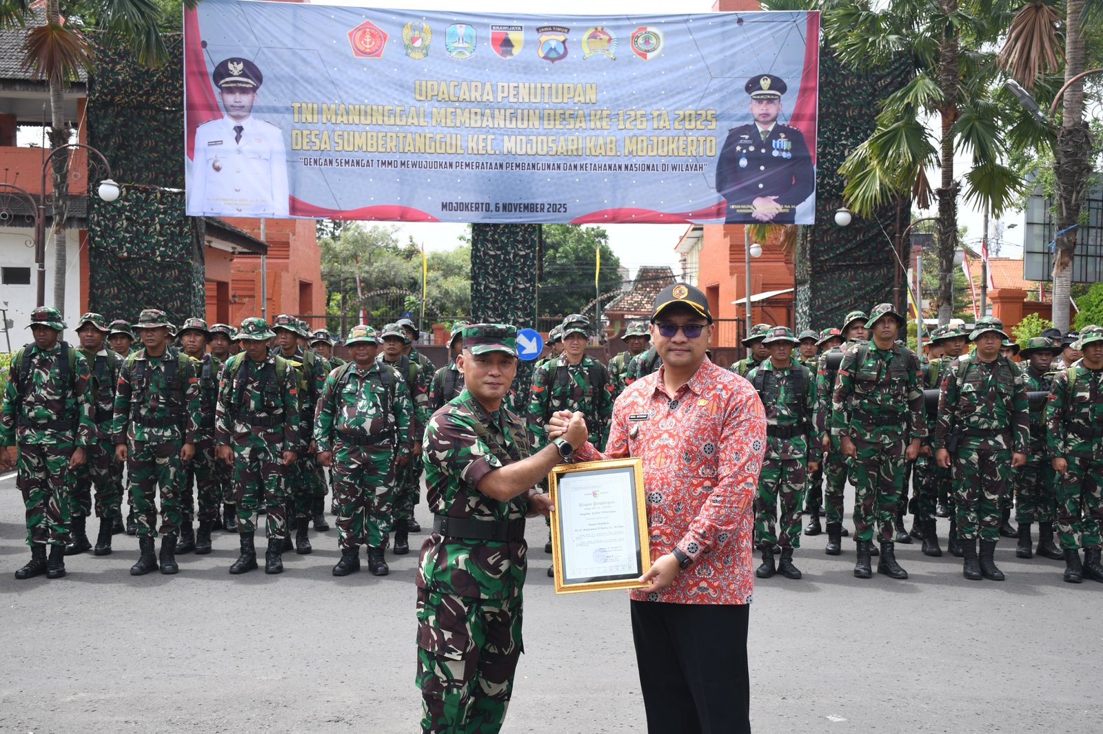 Mojokerto, – Program TNI Manunggal Membangun Desa (TMMD) ke-126 Tahun Anggaran 2025 yang dilaksanakan oleh Kodim 0815/Mojokerto resmi ditutup dalam sebuah upacara khidmat di Pendopo Graha Maja Tama (GMT) dan halaman Kantor Pemkab Mojokerto, Jalan Ahmad Yani Nomor 16, Kota Mojokerto, Kamis (06/11/2025). Kegiatan ini dipimpin Aster Kodaeral V/Surabaya Kolonel Laut Bagus Arianto, A.Md., S.T., selaku Inspektur Upacara.