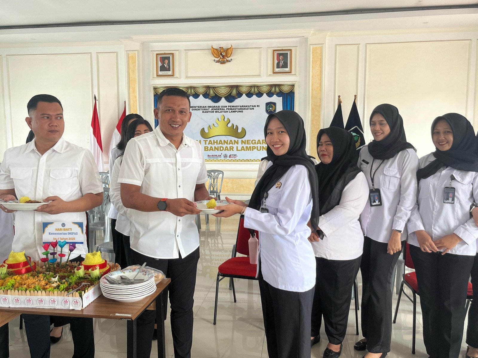 Sebagai wujud rasa syukur atas peringatan Hari Bakti pertama ini, Rutan Kelas I Bandar Lampung juga menggelar prosesi pemotongan tumpeng di aula usai pelaksanaan upacara. Pemotongan tumpeng dilakukan oleh Kepala Kesatuan Pengamanan Rutan, Rizqi Putra Sandika, bersama Kepala Seksi Pelayanan Tahanan, Arthayasa Pratama, yang keduanya mewakili Kepala Rutan Kelas I Bandar Lampung.