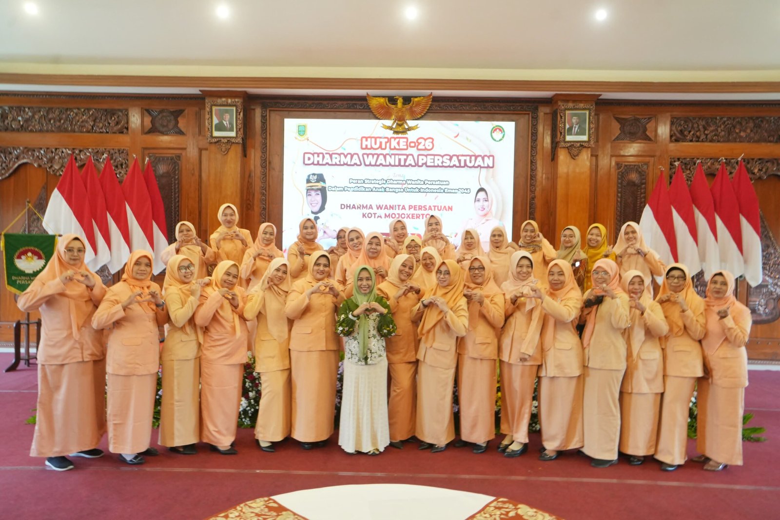 Kota Mojokerto – Peringatan Hari Ulang Tahun ke-26 Dharma Wanita Persatuan (DWP) digelar dengan khidmat di Ruang Sabha Mandala Madya Balai Kota Mojokerto pada Jumat (12/12). Tahun ini, DWP mengusung tema “Peran Strategis Dharma Wanita Persatuan dalam Pendidikan Anak Bangsa untuk Indonesia Emas 2045.