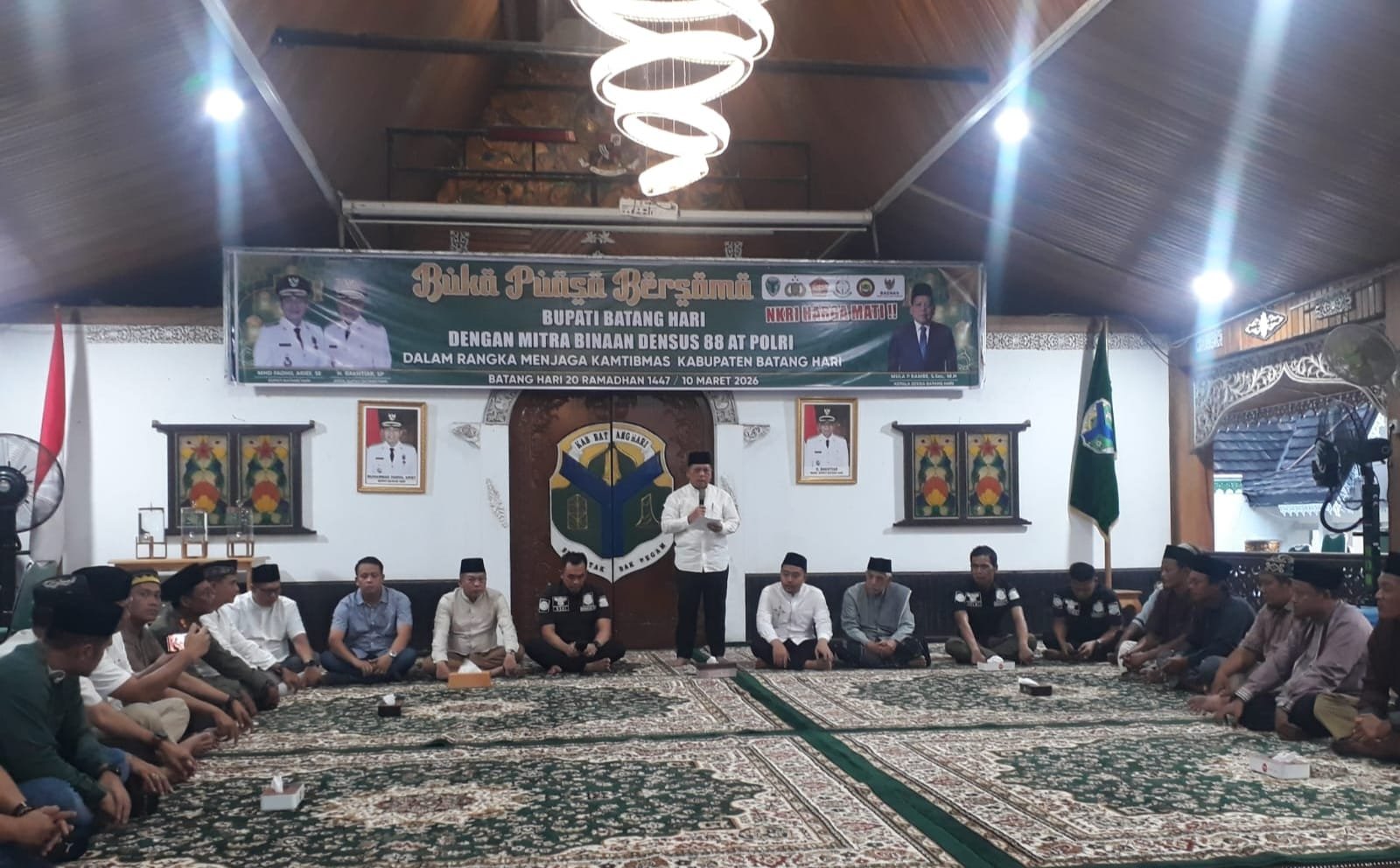 Batang Hari, majalahglobal.com- Dalam mempererat silaturahmi dan memperkuat sinergitas menjaga keamanan dan ketertiban masyarakat (Kamtibmas) selama dalam bulan Suci Ramadhan 1447 H./2026 M. Pemkab Batang Hari, menggelar kegiatan buka puasa bersama dengan Mitra Binaan Densus 88 AT Polri, bertempat di serambi Rumah dinas Bupati Batang hari, Pada Selasa(10/03/2026) pukul 17.00 wib.