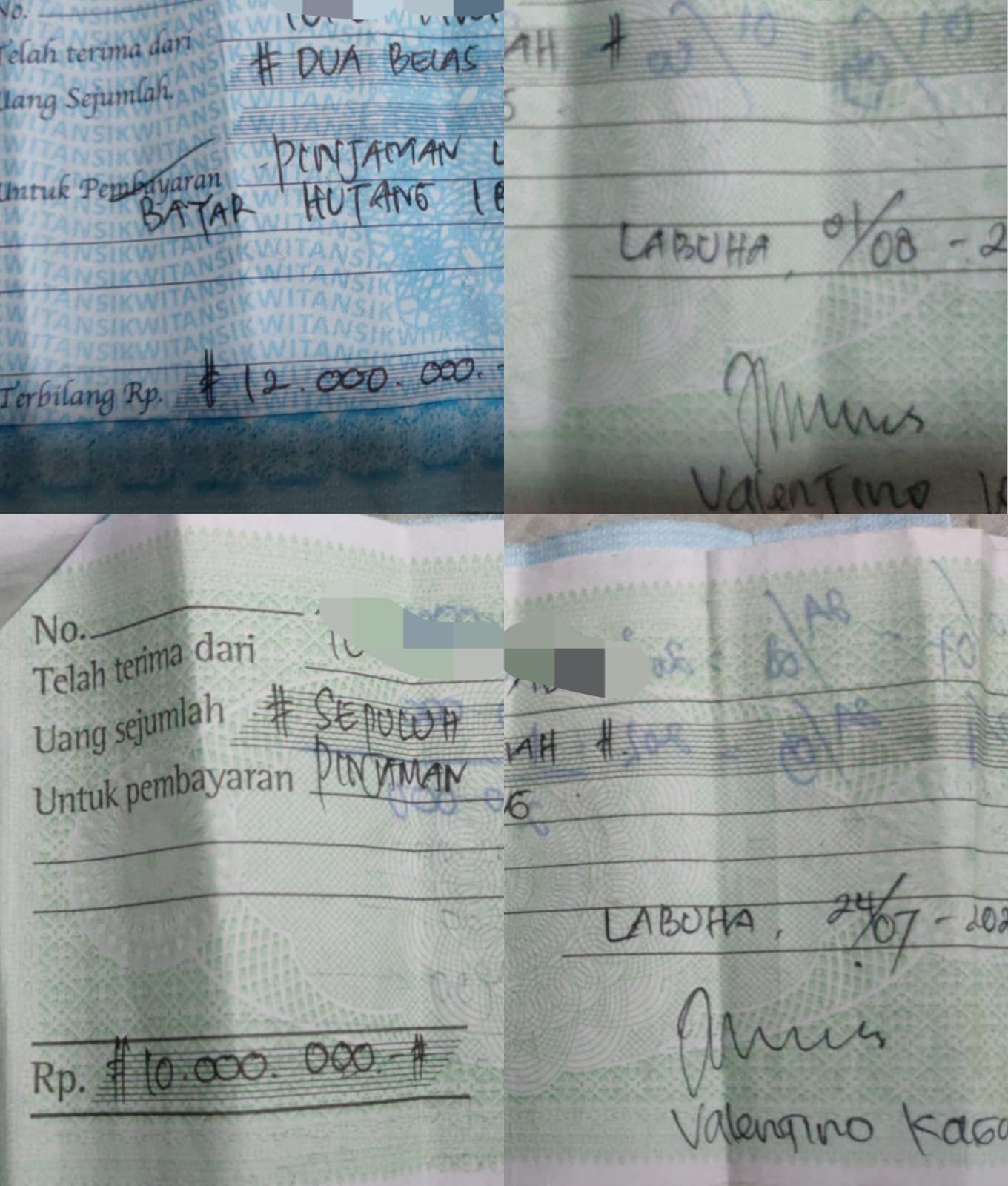 “Seauai bukti kuitansi sepanjang tahun 2025, Valentina Kagana 4 kali meminjam uang. Pertama tanggal 24 juli senilai lima juta, 31 juli sepuluh juta, 01 Agustus dua juta, dan tanggal 18 September sebesar dua belas juta rupiah,”Ungkap informasi yang beredar tanpa menyebut siapa korbannya.