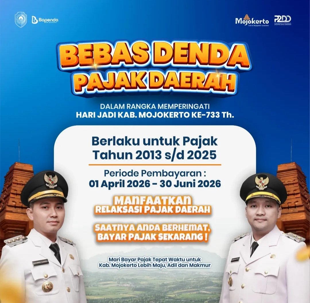 Majalahglobal.com, Mojokerto – Kabar gembira bagi warga Kabupaten Mojokerto yang masih punya tunggakan pajak daerah. Dalam rangka memeriahkan Hari Jadi ke-733 Kabupaten Mojokerto, Pemerintah Kabupaten melalui Badan Pendapatan Daerah (Bapenda) kembali menggelar program Bebas Denda Pajak Daerah 2026.
